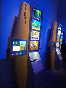 Possibly the greatest part of the exhibit is the huge room filled with home consoles, each in a glass case with the name of those who had lent them to the museum. They were in order of year, separated into eras. Each console had a screen attached to it with buttons that read “Action,” “Target,” “Adventure,” and “Tactics,” and hitting the button showed you the game in question. Tactics games on display included Utopia on the Intellivision, Dune II: Battle for Arrakis for the Sega Genesis, and StarCraft for the PC, while the Adventure category held much-beloved games like The Legend of Zelda, Final Fantasy VII, Shenmue, and Mass Effect 2. A complete list of the games can be found at the Smithsonian American Art Museum’s website.