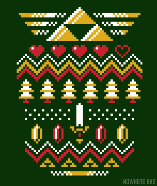 And, last but not least, my favorite one, which I am considering wearing as my ugly Christmas sweater! It’s “Triforce Holiday” over at Nowhere Bad: